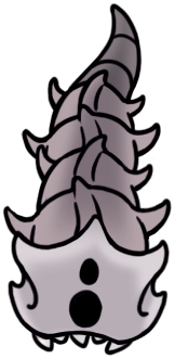 Silksong eventually returns us to The Abyss, first seen in Hollow Knight as the source of the dangerous shadow-stuff known as Void. The only abyssal llifeforms previously encountered there were small, slow-moving armored grubs, the shadowcreepers, and while those return in Silksong with a giant-size variant, the abyssal "glooms" are so striking that I really hope we haven't seen the last of Void-based fauna. "Gloomsacs" roughly resemble severed insect abdomens; segmented, grey cones with a few dangling legs and a white, flat front full of irregular holes, like the cross section of a lotus root! They hang from ceilings at rest, bringing to mind wasp nests, and can float through the air to latch on and drain energy from their prey!