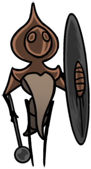 Splinterhorns, another of my favorite basic enemy designs, are cute but ferocious stick-insects resembling simple, twisted twigs with pale, globular eyes sticking out the sides of the head end, which forks at the tip and can instantly sprout into a pair of blades! Splinterbarks, meanwhile, look a little more like brown and withered leaf-insects, though their broad and ragged segments are mimicking shards of bark. They have long, segmented barklike abdomens with smaller legs than the splinterhorn, a broad leaf-shaped bark head with those same tan colored eyeballs, a pair of armored upper arms with broad, flat forearms and a set of functional wings. These ferocious creatures infest a version of Shellwood forest overtaken by thorny weeds, during a period where Nyleth has been dormant!
