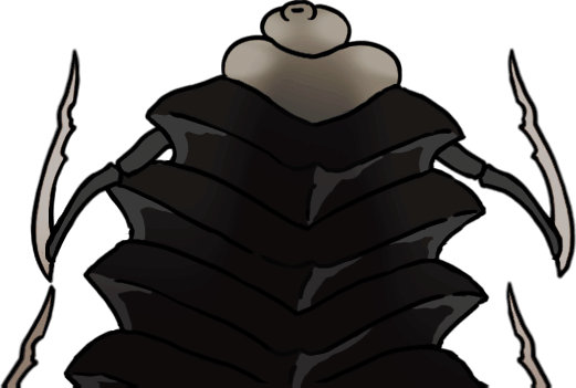 A simple concept with a cool execution! This cute little bony white bug has what just seem to be overlapping armor plates down its back, but get too close and its armor flares open into a fan of triangular blades on thin, stretchy stalks, like a chitinous peacock with even more ways to cut you up.