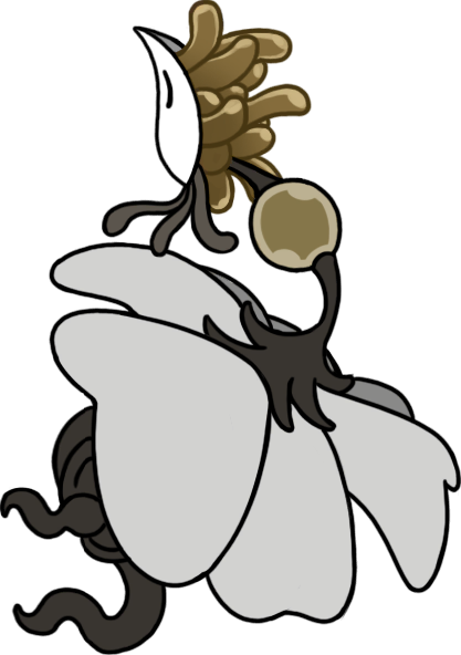 Queen of all those eerie flower-bug chimeras, Nyleth is something akin to a forest goddess in the local bug culture, the "spirit of the wood" and "health of the heart" according to her own needolin songs. She's also an extremely cool, beautiful and weird design, resembling a giant white-petaled flower with a knot of root-like legs on its underside and a large central stamen resembling a limbless, humanoid bug-lady-body; a fuzzy, dark base kind of reads as the hips, a clear yellow nodule further up the stalk implies a torso or bust, and a thin neck supports a pointed white mask with a clump of brown petal "hair." When she leans back and unleashes her pollen, though, we can see that there's nothing under the mask but a cluster of yellow tentacles! Extremely cool, easily up there with the best designed bosses of both Metroid and the Souls series, which this franchise is more or less a combo homage to.