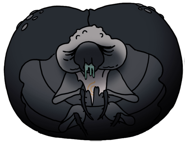 I really love the craggler's whole design. While it retains the wide, chunky, crabby shape of the juveniles, it hangs by its legs head-down, its mask tapering into a clump of little wiggly finger-points, with two blunt shovel-like arms to either side. It's basically an arthropodal star-nosed mole! Cool!! And it dribbles acid! Cooler!!!