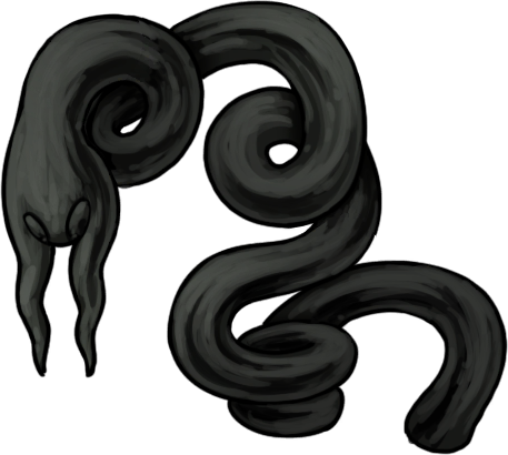 We've seen plenty of different worms, grubs and other vermiforms in this setting, from insect larvae to flukes, but we've never seen such a long, ropy, smooth-bodied serpent of a worm before Greyroot, and while there's a possible plant connection in the "root" and "bud" terminology, Greyroot most of all resembles either nematoda - a phylum with thousands of documented arthropod parasites - or nematomorpha, a distinct but superficially similar looking phylum of entirely arthropod parasites, which some of you may know as "horsehair worms" or "gordian worms." Nearly any insect or arachnid may live its entire life packed full with countless coiling freeloaders ...or the countless coils of one VERY BIG freeloader...from either the nematoda or nematomorpha, exhibiting a wondrous diversity of complex life cycles that just kind of bias towards ending in a rather similar fashion, because sooner or later mother nature decides that one of her many beloved worms has been holed up indoors long enough.