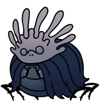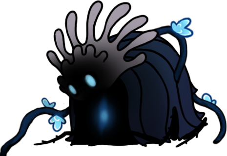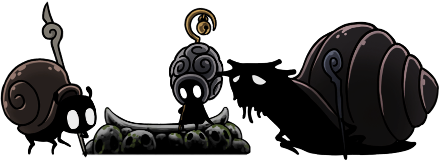 One Snail Shaman was already encountered in Hollow Knight, but three can be found in Silksong. All snails we've now seen have solid black shadow-like bodies with large, luminous white eyes, but their shapes can vary quite a bit! The "Chapel Maid" is similar in shape to any typical humanoid bug, save for the coiled snail shell weighing her down. The "Caretaker" is another humanoid one, but his shell is on his head and covered in multiple swirls, like a big grey brain, and the "Bell Hermit," the largest of the three, has an actual snail-like body shape, with the foot underneath and the thick neck-stalk and everything, plus four short, knobby horns on his head and some tendrils hanging off his face.
