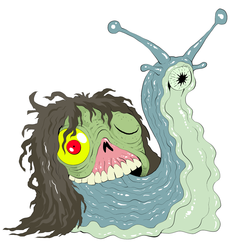 But for our generic Halloween version, let's say the curse of cranial gastropodification probably begins with a little slug or snail slime. Let's say this must be brewed into a potion along with the complete upper skull of a human cadaver and a sample of human saliva or mucus; even the dried salivary contents of some chewed-gum, if our spellcaster is desperate enough.