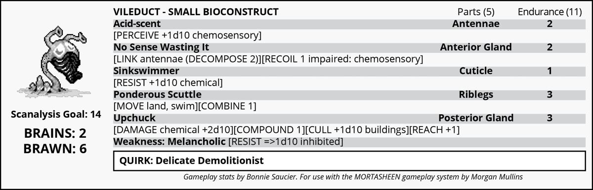 Along with both the previous entry and the next one to follow, Vileduct is part of a long line of monster ideas we just tend to call "little guys;" smaller, simpler, humbler monsters who focus on doing just one thing really well, showcasing a single battle gimmick in a "minor video game enemy" sort of way, with a point total low enough to team up with even a brand new player. If you're like me and you obsess over the "viability" of your favorite collectible monsters in your hypothetical in-game teams, don't worry: Mortasheen's point-based system makes a horde of Little Guys just as formidable as a smaller squad of Big Guys, and even someone who focuses on the biggest, toughest beasts may need some scurrying rat-thing to fill in a leftover gap. It's exactly how I always wanted Pokemon to work, personally; why shouldn't I be able to beat some jerk's six mythicals with 22 bellsprout??When I sat down to come up with an "acid damage" Little Guy, I knew I wanted it to be really alien and peculiar, evoking some kind of unfamiliar body organ system and really look right off the bat like a creature that only fights via chemical weaponry. I went for a pitiful, fragile and sickly appearance, with anatomy that could possibly remind you of something "half-digested" itself, and a face that evokes a biohazard mask, actually borrowing the overall shape from one of my personal favorite, deeply unappreciated shapes in the animal kingdom, a pupating mosquito.