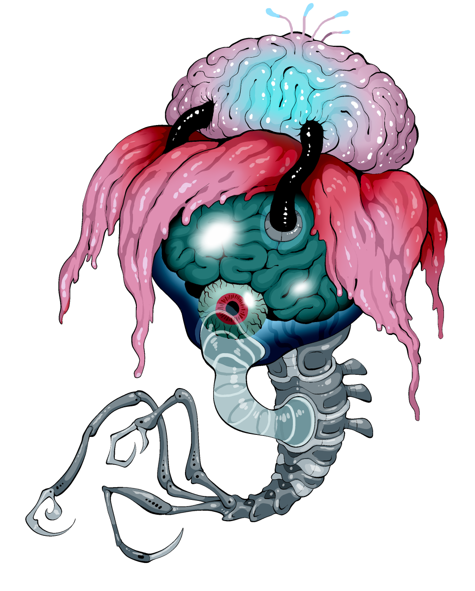 This monster appears to be a brain and a single eyeball housed in a transparent brain-shaped bubble. A translucent hose extends from the front like a breathing apparatus, connecting to a mechanical body resembling a short spinal column, which ends in three long, thin, insectile limbs. On top of the creature is a mutated plant resembling a second brain, with fleshy pinkish petals draping down over the mechanoid's head. Two black cables connect the monster's brain to the plant.