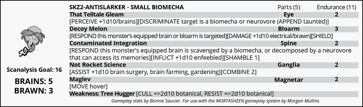 While all of the other monsters for this mortaween were chosen or at least conceived of in advance, the Antislarker is something that was conceived of, written, statted, and illustrated all over the course of two days as I had a burst of inspiration. Several of the elements leading to this design already existed in my mind- the idea of baiting a slarkzapper with a bloarm, the idea of a biomech going haywire bc it tried to use a bloarm as its brain, the idea of a biomech that exists exclusively to protect its brain that would be little more than a tightly wrapped membrane over the donor brain, based on old art bog didn't want to reuse for a monster. Bog did some redesign sketches for turning this into a monster with that idea, but was never fully sold. When the Brainslark came out, I started percolating the idea of baiting a slarkzapper with a bloarm, and just two days ago I synthesized all these ideas together to make the starter-compatible biomech you've all been begging for, all at once.GAMEPLAY BLOCK: