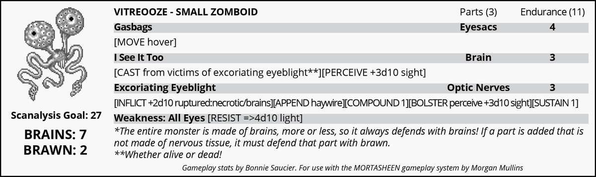 The monster's bite injects a cocktail of Zomboid nanomons and pathogenic stem cells, which set to work deconstructing any tissues they encounter to rapidly build functional new eyes. The steadily spreading "eyepox" not only overwhelms the host's senses with new visual information, but dehydrates the host as body fluids are continuously wept from the agitated, unprotected oculars as a thick, pinkish mucus, rich with proteins and putrefying bacteria. This material is particular enriching to the Vitreooze's own flora, and it can receive visual information from any of the host's eyes (new or otherwise) through its nanomon network. It is even capable of directing its nanomons to slow or reverse the infection if need be, and can leave them almost indefinitely dormant until needed again.