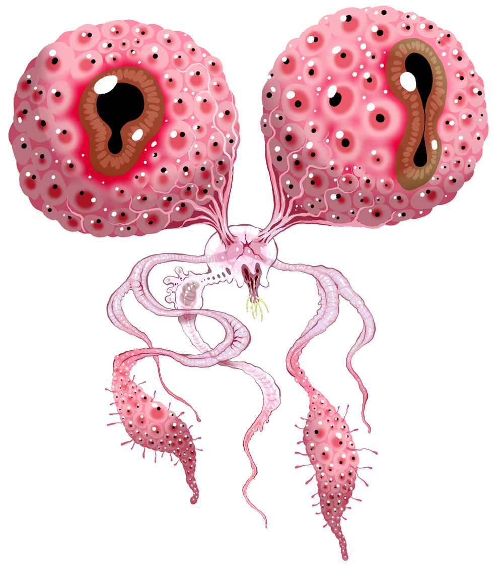This monster has a thin, translucent body like an elongated eel-shaped embryo, with two long ribbon shaped tentacles sprouting from its small knoblike head. Each tentacle ends in a tapering, berry-like cluster of pink tinged eyeballs. It has no jaws, but a small, dangling protrusion of gum tissue hangs from its open head and bears a handful of thin, wispy needle-like fangs. The entire creatures dangles from two gigantic, bloated balloon-like eyeballs, covered in turn by dozens of smaller eyes.
