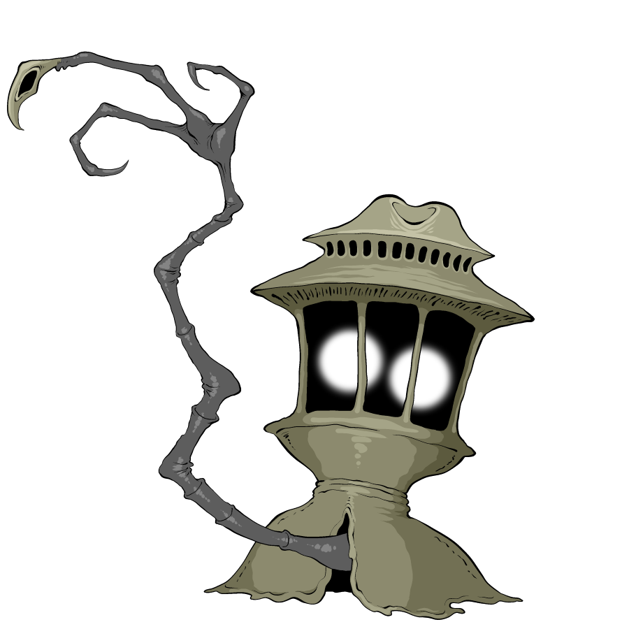 This monster has a shape like an old oil lantern, but made of a clothlike skin with a top like a brimmed hat. The bottom of the "lantern" flares into a small skirt that parts in the front, like an open jacket, and a very long, many-jointed, dark grey arm can emerge from its recesses with three long, clawed fingers. Its index finger ends in a brassy colored, oversized claw with a large dark pore, almost like the tip of an ink pen. The interior of the lantern is pitch black, with two large luminous white spots for eyes.