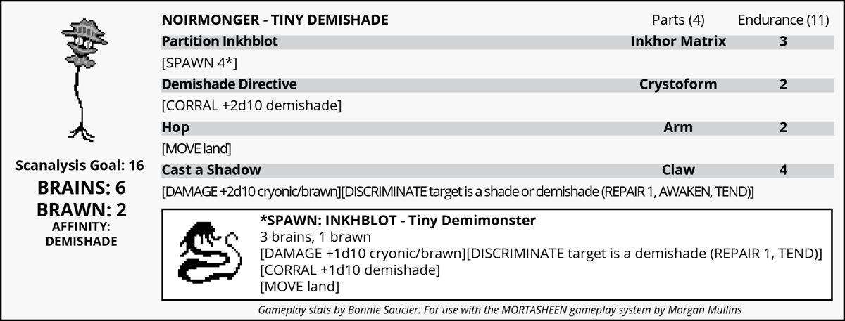 Generated by Mortasheen to help monitor and maintain its other Shades and Demishades. The Noirmonger can inject subjects with its Shade inkhor through its hollow middle claw, carrying with it millions of specialized nanomons adapted to repair and revitalize other Shades or even kickstart the regeneration process of an effectively "dead" Shade. Steadily producing new inkhor, it can shed excess portions as autonomous, amorphous drones or "inkhblots" it controls remotely, allowing it to keep tabs on a large number of subjects at a time.