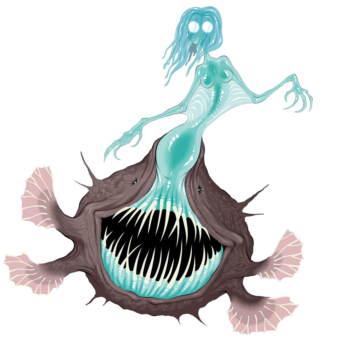 This monster's lower body resembles a dark, bloated anglerfish with many long, thin teeth. Sprouting from the pale blue inner flesh of its maw is its upper body, a translucent mermaid-like shape with long, thin arms and a rounded, humanoid head. The upper face is mostly covered by gelatinous tentacle-like "hair," but two bright white, circular glowing eyes shine through the jellylike tissue.