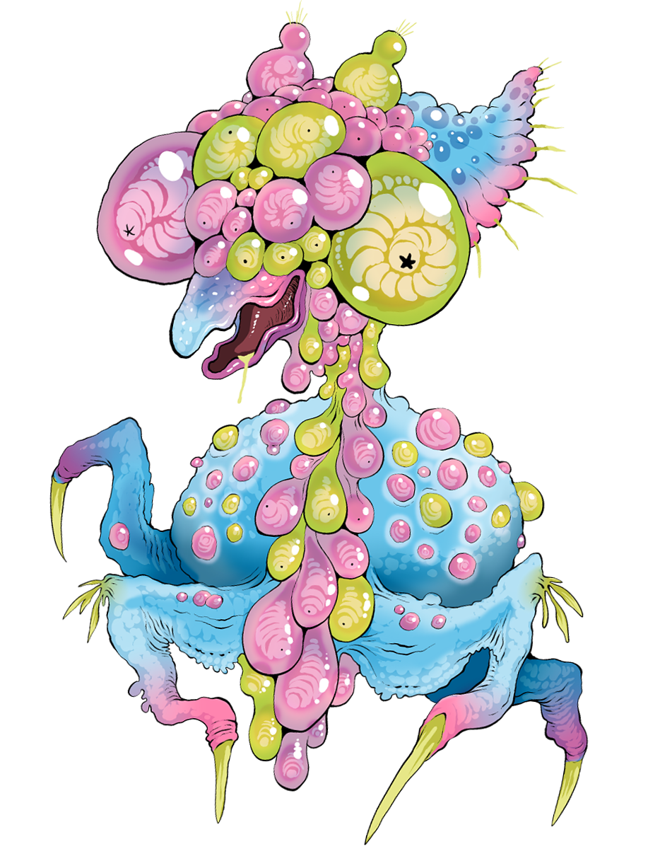 This monster has a vaguely bird-like outline, its round body supported by four spike-tipped legs reminiscent of plucked wings. Its head is supported by a turkeylike neck, the back of its cranium tapering to a lumpy point while the front bears a rubbery beak-like muzzle. Its face, neck and "wattle" are completely encrusted with transparent, pik and yellow bubble-like sacs, with two particularly large ones evoking a pair of bulging "eyes," and a scattering of additional sacs throughout its body. Pulsing within each sac is a coiled, grubworm-like shape.