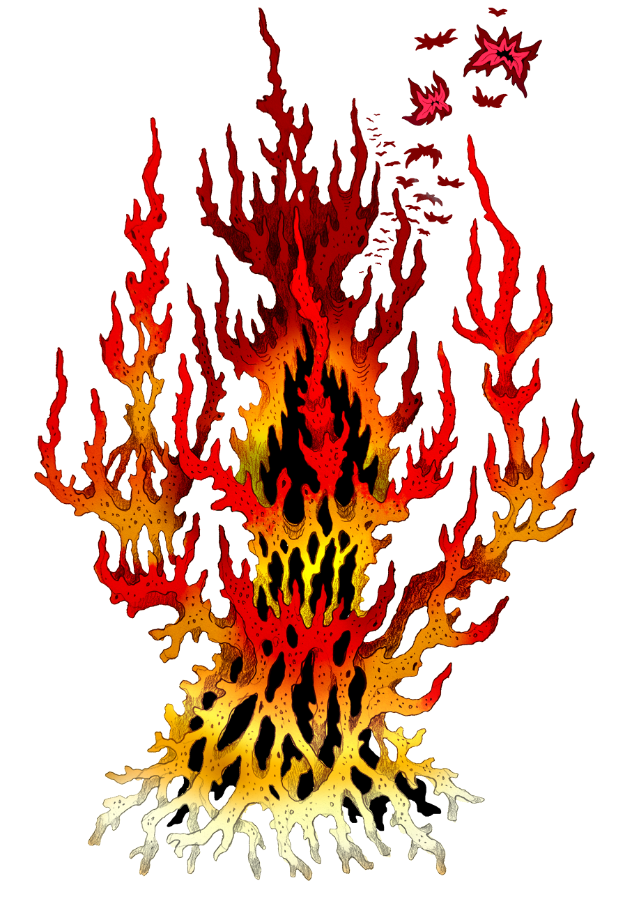 This monster resembles a towering "castle" of heavily branching coral. Its central column swells halfway up its length with a gaping, cavelike opening, lined with jagged stalactite-like growths. A thin jagged branch sprouts straight up in front of the "cave," visually dividing it like a pair of eye sockets. Irregular, dark gaps under the main orifice evoke a ghoulish, rotten "mouth."