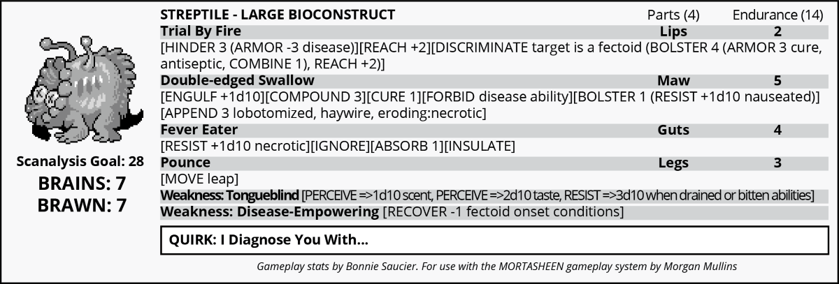 Not too much to say here that I didn't say already! What we now call Antiseptile seems to be a fan favorite (I even ran into someone in real life by pure coincidence who knew what Mortasheen was and liked "Streptile" the most!) but its old name really implies a creature that either has or causes some kind of throat infection, so here's the new Streptile, which feeds things to the microbial culture living in its gullet. Bonnie suggested it lean harder into the concept of "superbugs" and that its disease colony should be an assimilated Fectoid, since Fectoids are common prey to its more hygenic cousin.GAMEPLAY BLOCK: