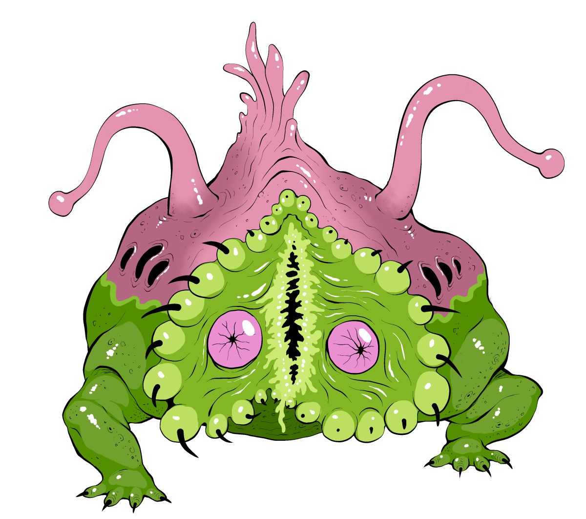This monster has a fat, slimy toad-like body with two long, knob-tipped feelers. Its mouth opens vertically into two slimy lobes, lined with fleshy knobs that each house a single, retractable black needle. Its round, lidless eyeballs are inside the mouth, and a ragged looking vertical orifice between them foams with paler green slime.