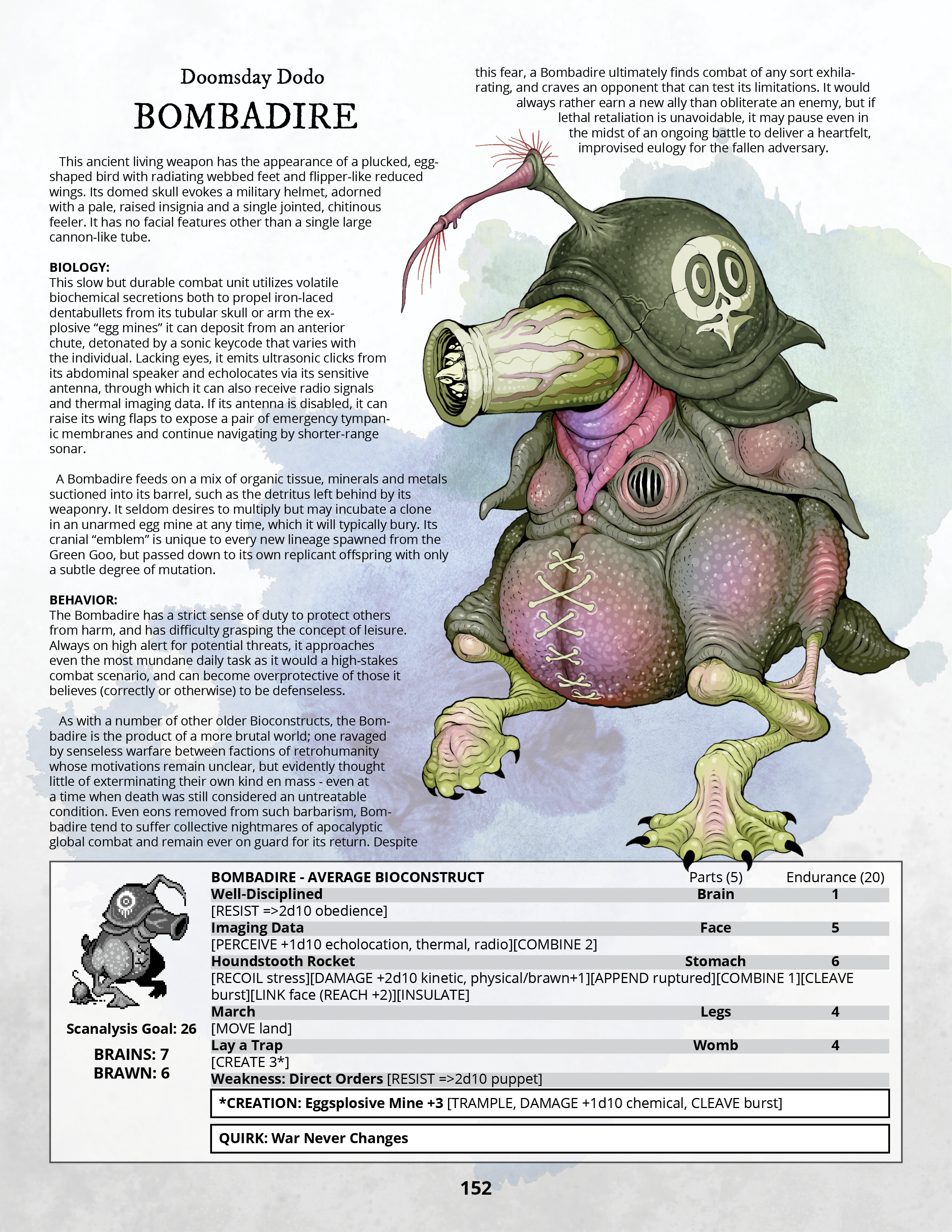 The "warbids" are older monsters and popular fan favorites, so the original species, Bombadire, made it into book one with expanded lore, and I sketched this new "missile tower" cousin a while back as a potential addition for future books. You can have it early, and you can also have a preview of Bombadire's book page:GAMEPLAY BLOCK: