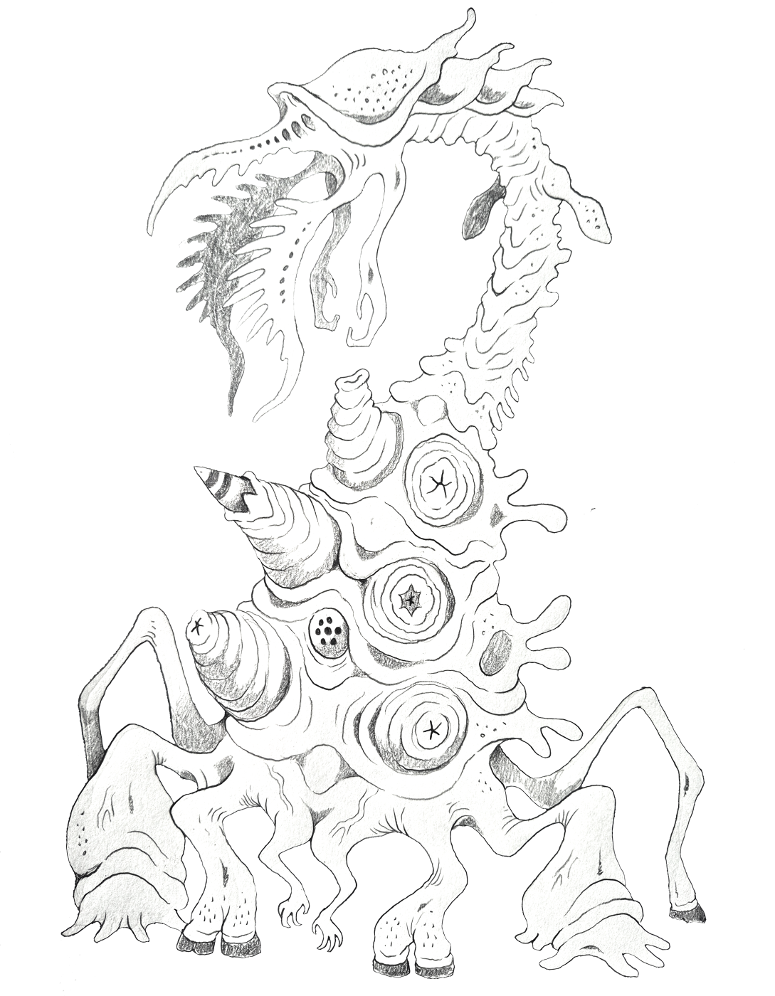 This monster has a wide base with two tiny arms in the front, two larger chunkier arms it stands on as legs, and a third pair of longer, thinner legs that end in hooves. The body tapers up into a very long neck with a bird-like head, the eyes covered over by an organic helmet. The upper beak is long and hooked, while the lower beak splits into two large comb-like structures. Down its chest are six large sphincter-like orifices in two vertical rows, and two metal "speakers" embedded between them, one above the other.