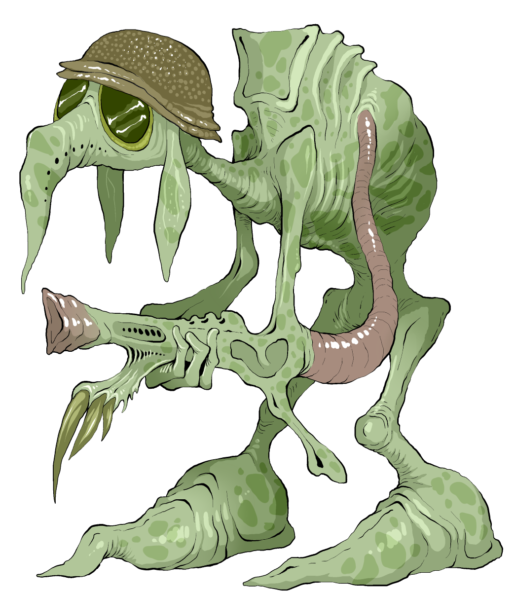 This monster is a gangly-limbed humanoid with strange proportions. Its head sticks forward on a thin neck and has glassy eyes like the lenses of a gas mask, its mouthless face tapering into a droopy point. Two floppy ear-like straps dangle from the sides under an organic "army helmet." It has stick-thin legs but very large, tapering boot-like feet. Its back is weighed down by a large, segmented, boxy hump with a flaplike opening in the front. A fleshy tube connects this "backpack" to a bony gun-shaped left arm. The entire creature is wrapped in the same leathery green-brown skin.
