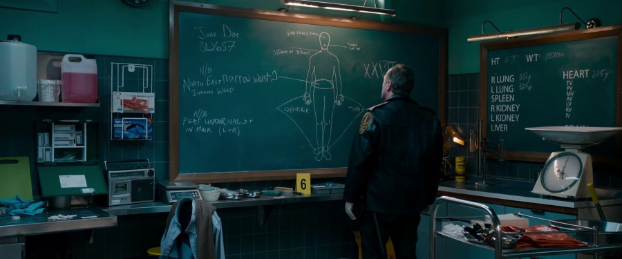 As they work, an intense storm begins to develop outside and interferes with the electricity. The door to one of the body drawers keeps popping open, refusing to remain latched, and the radio keeps changing stations to one that repeatedly plays the classic song "Open Up Your Heart (And Let The Sunshine In." If you don't know the song, enjoy the very same recording used in the film: Two things of interest are found within the woman's stomach: deadly poisonous jimsonweed, which is not found in that part of the country, and a small bundle of cloth. This is revealed to contain her missing molar along with strange writing, and similar writing is found to be tattooed to the inside of her skin. It is at this point that a power surge causes the lights in the room to actually burst, and as soon as Austin turns on his phone's flashlight, all of the morgue's drawers are hanging open, with their bodies nowhere to be seen.