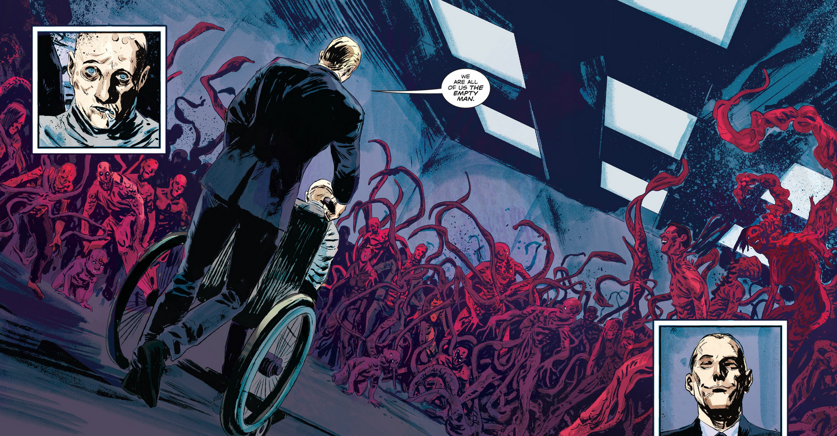 Arthur happily expounds upon some fascinatingly strange theories on the nature of mind and matter; that thoughts and concepts are one with physical forces, that all things are connected by the mnemosphere, or "the sum of all conscious thought," and that "virus-like vectors" can facilitate transmission between the thoughts of individuals or even break the boundaries between what is imagined and what is reality. According to him, the Empty Man isn't a literal entity, but a "focal point for mental energies," a symbol they use to personify their principles.