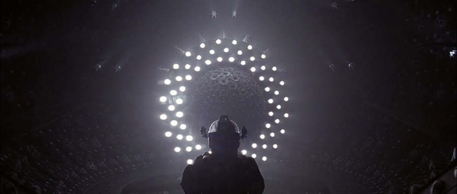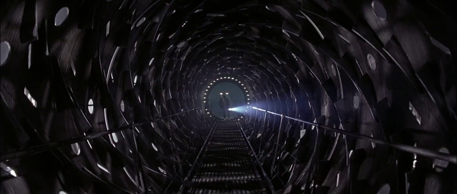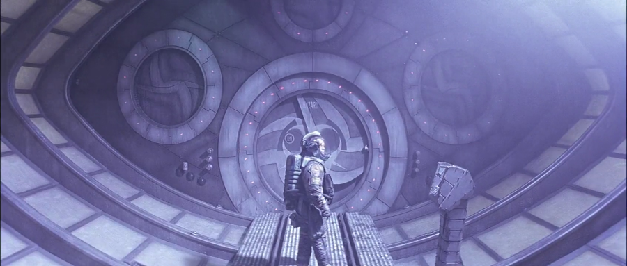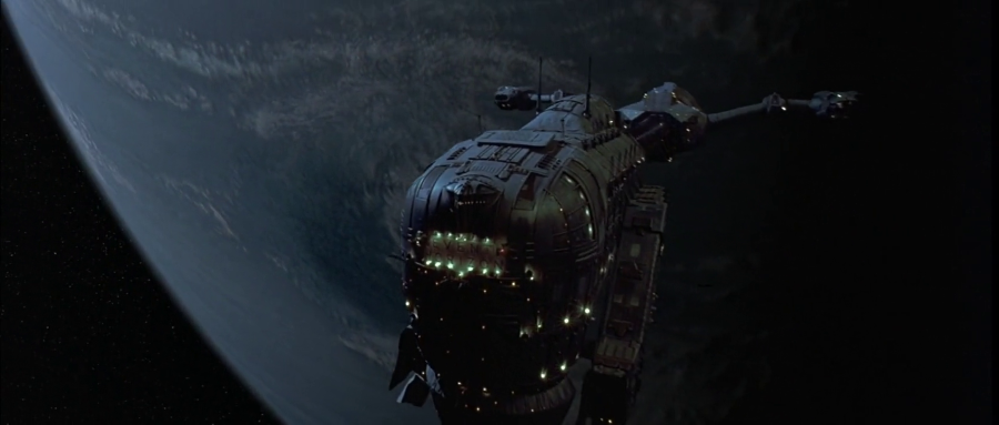 Aesthetically, it's a fairly typical starship on the outside, but the interior setpieces are gorgeously foreboding and subtly designed to communicate the feeling of a sinister living force even before the reveal. The iconic gravity drive itself not only resembles some sort of demonic artifact, but the halls and gates of the ship have an eye-like shape, and a strangely churning hallway to the core recalls some sort of giant meat grinder ready to devour its intruders alive. It's almost absurd how demonic this machinery already looked; if these people only knew they were living in a horror movie, maybe they'd have known not to build something that both rips open space-time and looks like a glowing vortex of black fangs.