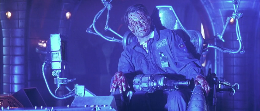 From there, the crew begin to experience disturbing, lifelike visions constructed from their past traumas, deepest guilt and darkest fears, and you can already see some parallels here to Galaxy of Terror. Some see grisly manifestations of deceased loved ones or people that they've wronged. Weir in particular begins to see the "ghost" of his wife, who had killed herself for unknown reasons while he was away, working on the Event Horizon itself. Her phantasm appears to him with no eyes - only empty, red holes - promising that she's waiting for him to join her.