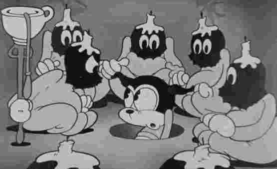 Next Clyde takes his aggression (or is it Lawrence Peppers aggression???) out on some tramps who are trying to warm themselves around a campfire. He forms from their burning firewood, and well........."turns the tables" on that situation. I know later cartoons would routinely show characters burning up into ash (how many times did it happen to poor Wile E? Or Tom?) but I didn't typically see that gag in cartoons this old, and it wasn't even done in a comedic way. No blinking, grumpy eyes in these ash-piles. Just.......ash piles.