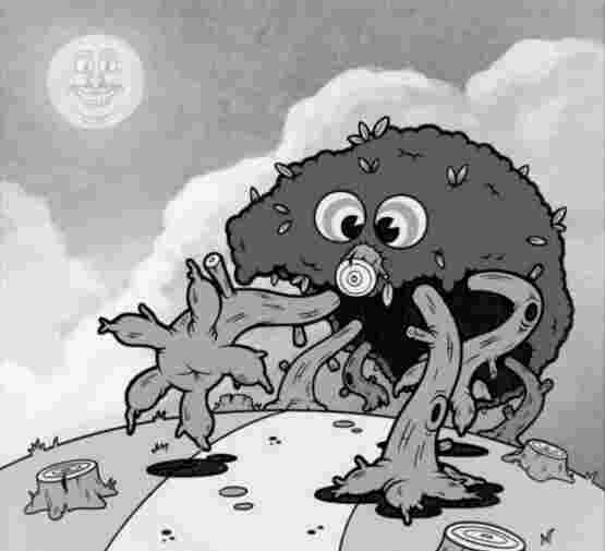 WOW!!! I told you this cartoon looked good didn't I??? Notice the sign, "Clyde Wood." I think that might be the tree's name! Yeah, nice to meet ya "Clyde!" You don't fool me!