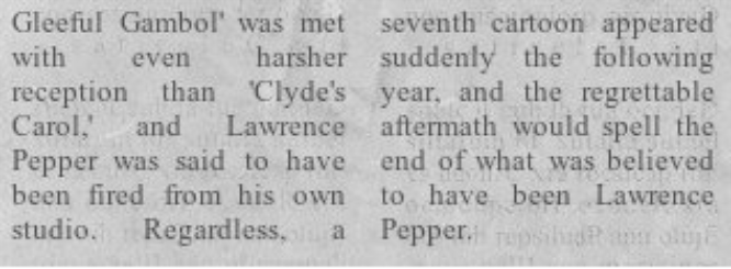"Clyde's Carol played only once, to a booing and hissing audience. Flooded with complaints, Lawrence asked that the film not be played again. His turnaround had previously been only one year between cartoons, but his next would take nearly two years to debut."