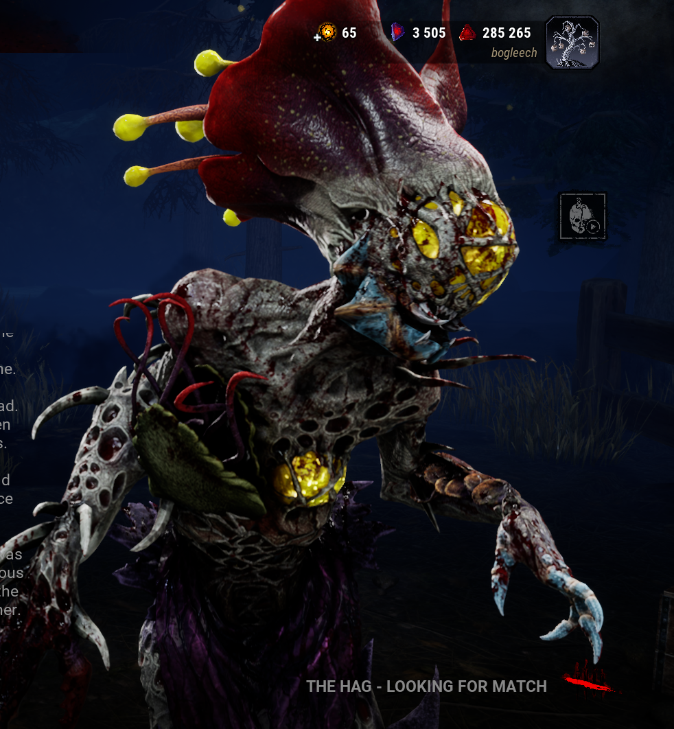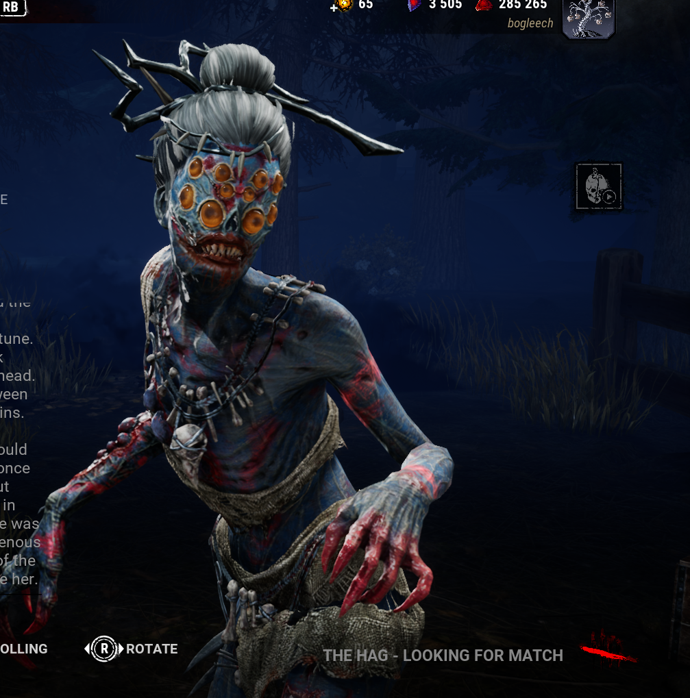"The Hag specializes in creating a dangerous web of Phantasm Traps, to be triggered by unsuspecting Survivors. She can instantly teleport to a triggered Trap, striking the Survivor that sprung it. Lock down key areas, make rescues a deadly gamble, and end chases quickly with strategic Phantasm Trap placement."