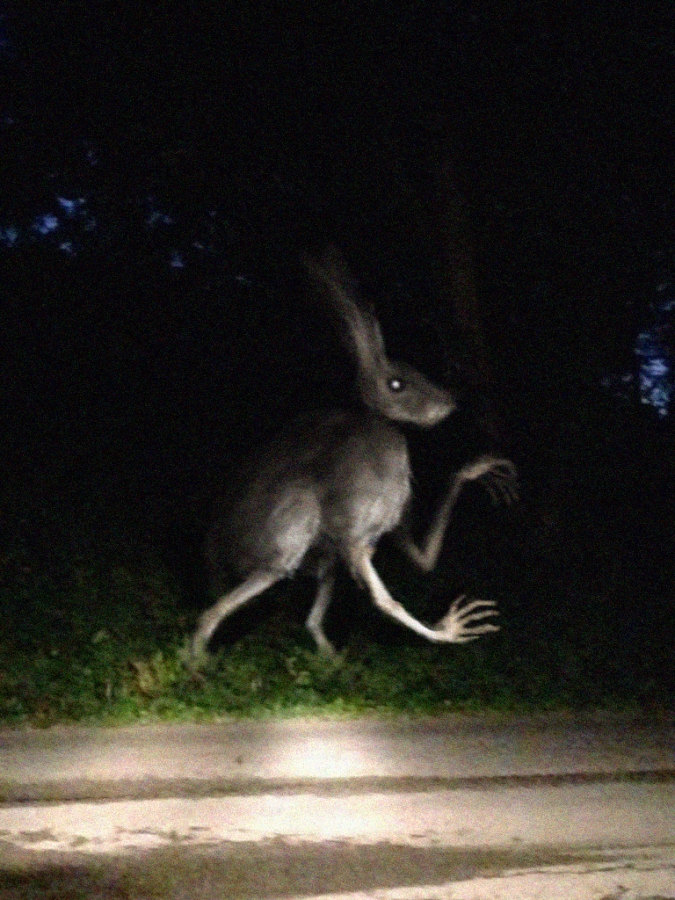 This is one of the longest captions, and it's a solid but fairly typical little monster encounter...except, of course, for the image. The fact that this is some sort of messed-up lagomorph changes the entire feeling of the story from your standard "there was a ghoulie of some sort" to "what the hell went wrong with the local wildlife?!"