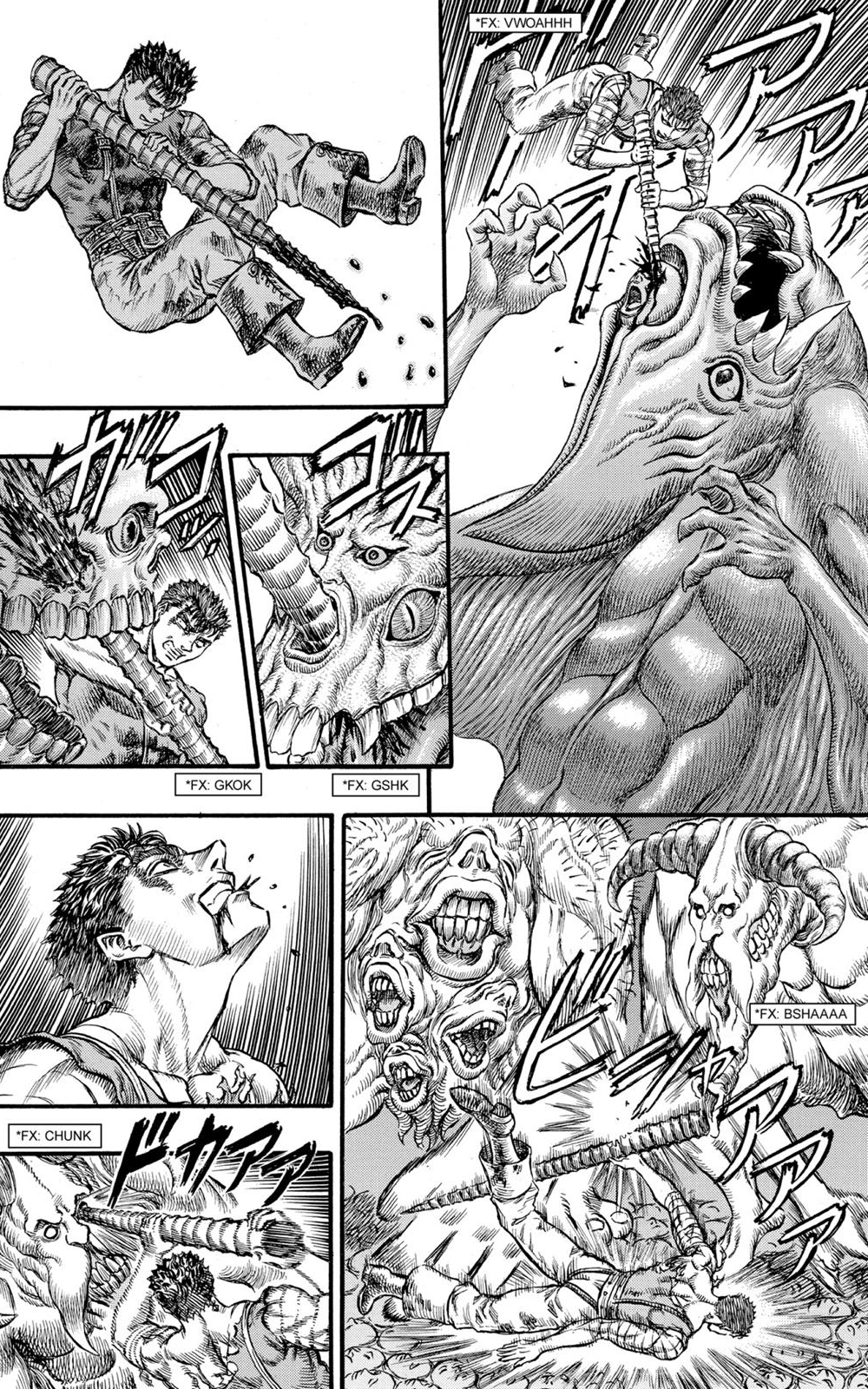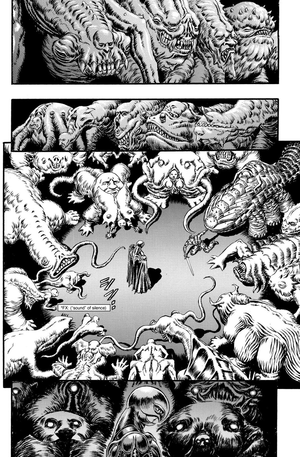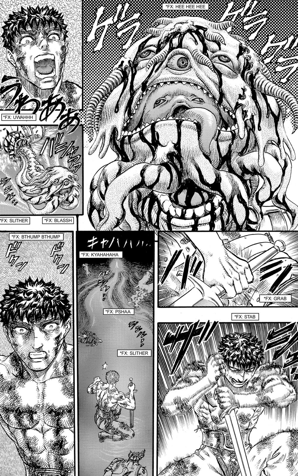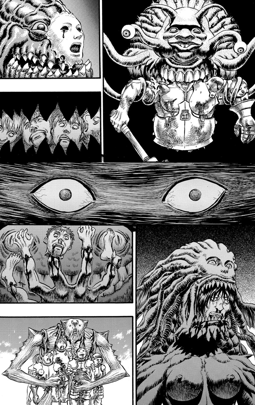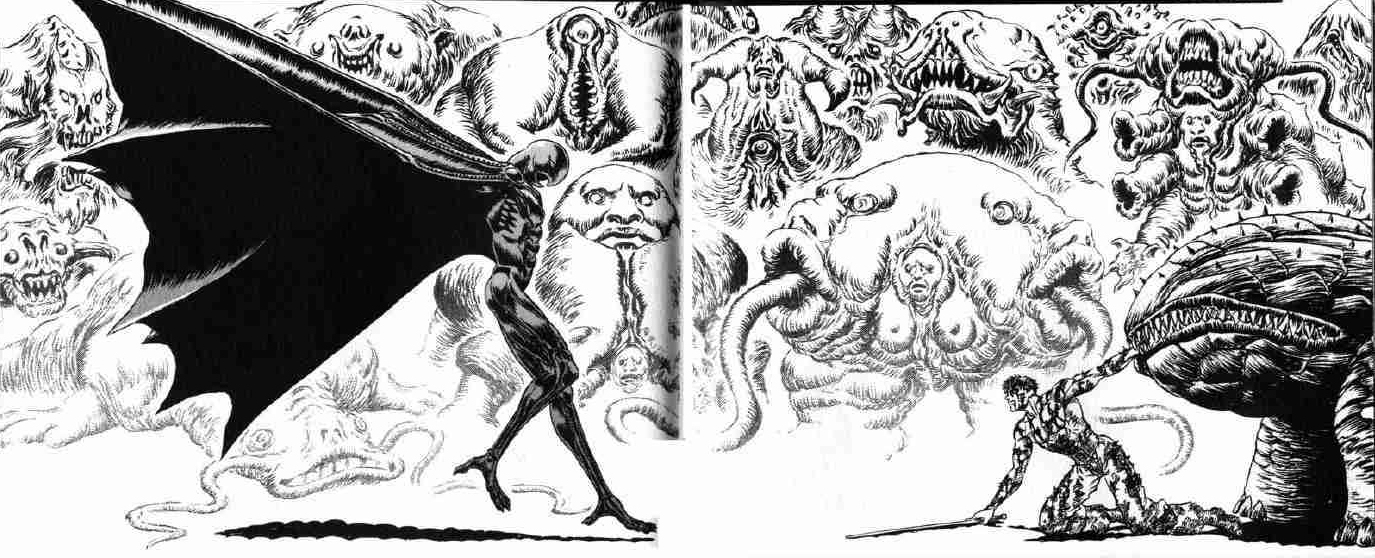 Far below is the weirdo whose tusk Guts rips off to use as a weapon, tstabbing a freaky looking thing with another human face below the maw, and then there's that totally creepy bastard whose "mouth" is an entire snake-baby on an intestine-like neck, and sthe torso body is also kind of like a giant old man head with tentacle whiskers.