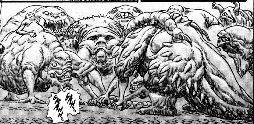 one more of the crawling, teardrop-shaped variety. Miura really likes designing this shape and placing a face or other appendages right where they'd make it look like a slithering crotch-monster.