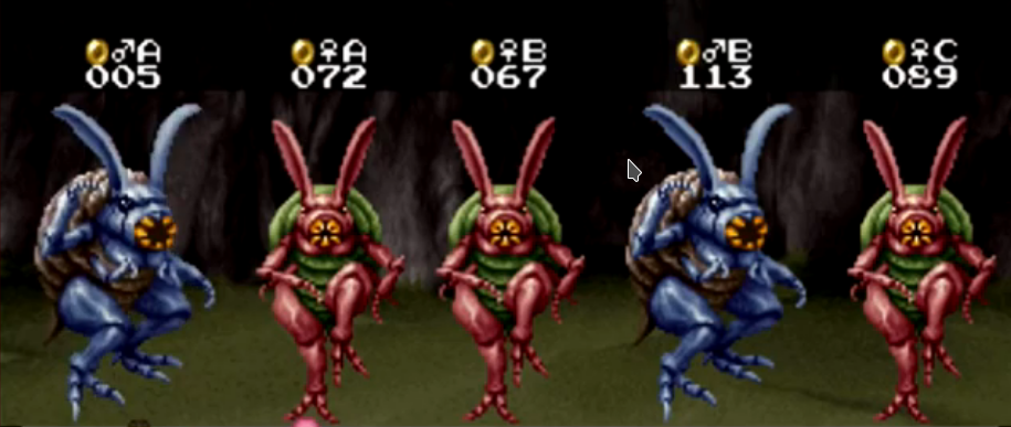 What will also sound remarkably familiar is that there are at least 150-some species in Linda Cube. Considering almost all of them come in two distinct gender variations and a number of them were completely redesigned in a remake of the game, the total number of creature designs are pretty staggering for the time, and I'd have NEVER been able to gather as many as we now have if not for my spouse's Japanese language skills yet again.