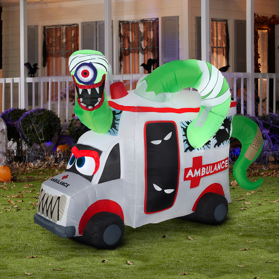 I almost sought to devote an entire article to this one, all the way back in August when I first saw it at Lowe's, but in the end, I couldn't quite squeeze enough words out of it. Obviously a giant, one-eyed, bandaged, bright green worm monster weaving through a haunted ambulance would have been one of the single most amazing Halloween things I ever could have witnessed at any time in my life, but this happens to come during a time in my life when I'm best known for a webcomic prominently featuring medical monsters, sentient objects, worms, and even a bright shade of green as an iconic symbol. This is it: the Awful McHospital. We found him at last.
