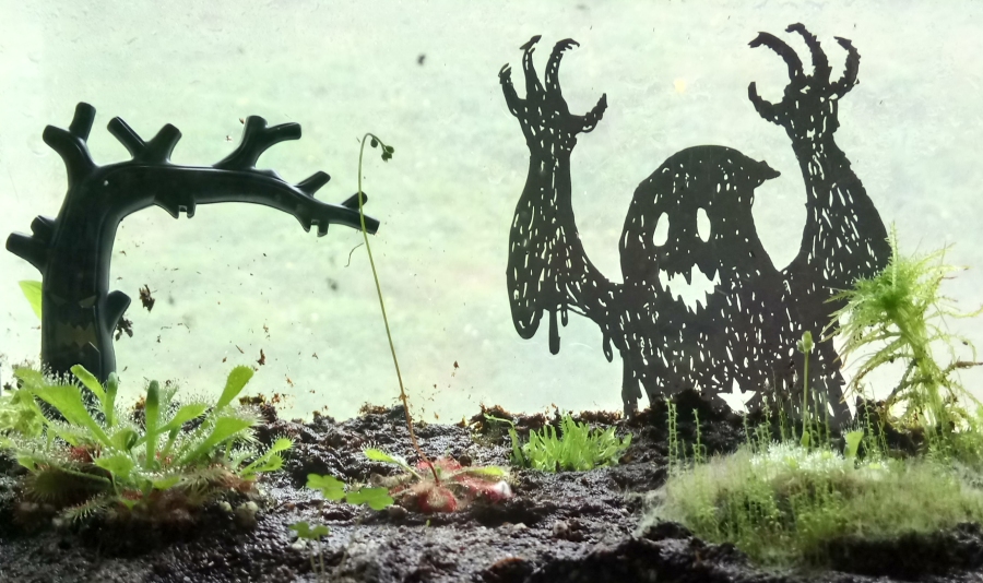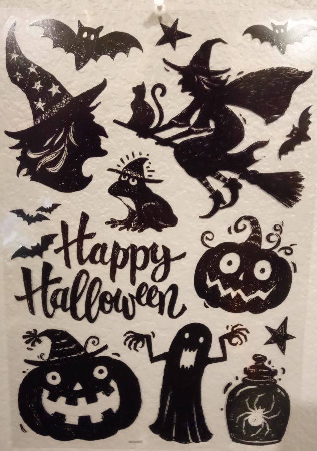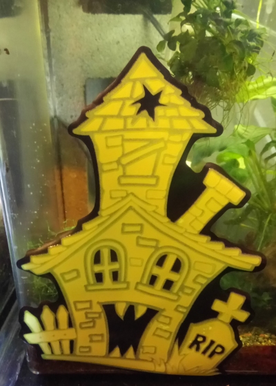 I actually spied these same window clings in the background of someone's unrelated Halloween photos, immediately checked ebay, and miraculously found some being sold from way over in Britain. I don't think I need to explain why I did that, do I? The simple addition of four little fangs on that haunted house turns it into a splendidly maniacal monster itself, and that witch rising out of (or at least looming behind) her own cauldron is a badass design. I've never seen a witch with a simplified, noseless, kind of opera-mask looking face like that and I absolutely adore her. These are now clinging to a tank of shrimp and a tank of slugs, respectively, if you needed to know that.