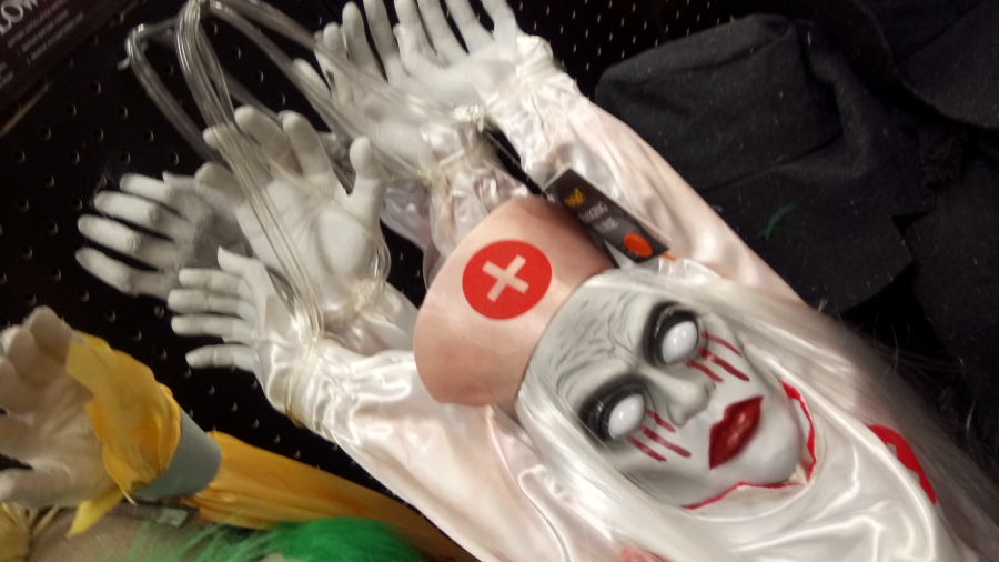 I never find that much to talk about from Spirit stores, oddly enough, but you know I'm a big fan of medical monsters, and while this nurse could have used a less human, more Silent-Hill-Ripoffy face in my book, I appreciate that they still let her be more on the ghoulish side with grey, dessicated flesh, and what really earns it a spot here is the fact that she's hung up by plastic tubing instead of the fake chains that literally every other hanging ghoul uses. The only variation I've ever seen before might have been rope or barbed wire, but I mightbe imagining that. I'm pretty sure everything in this series of props used chains up to this point. It's an implication that somebody's shackling zombies up in a hospital like it's a haunted dungeon, and that's fairly hilarious.