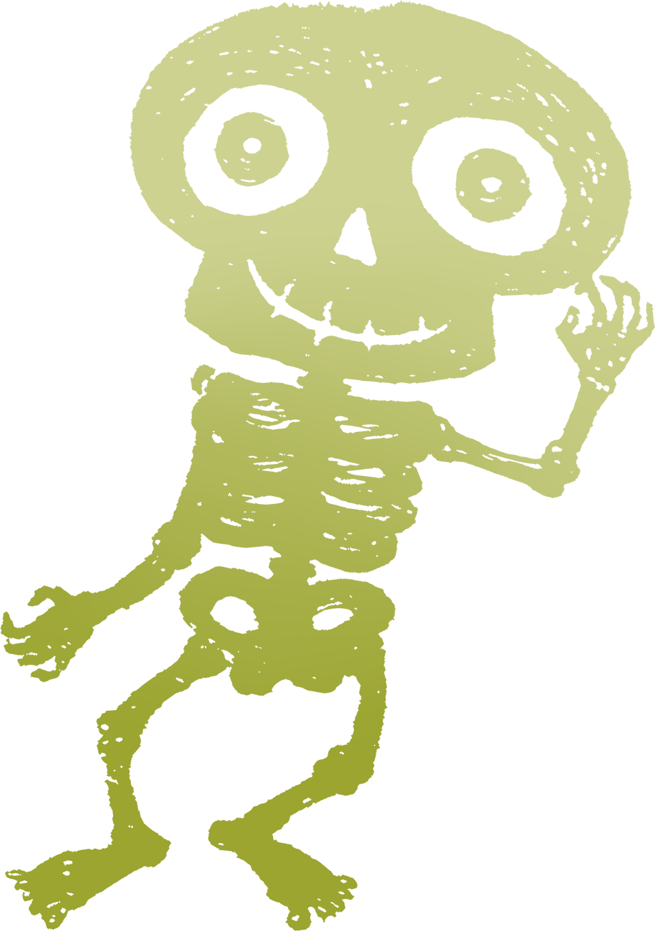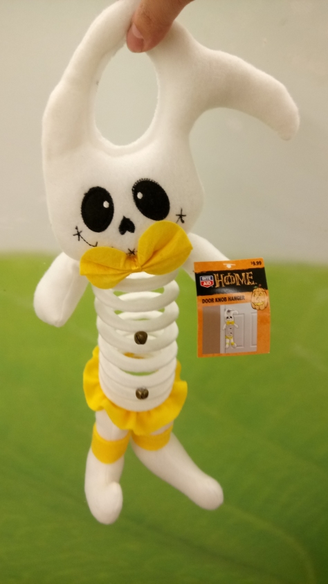 These were sold at Rite-Aid this year, and it's ostensibly a "skeleton" or "ghost" you can hang from a doorknob, but I feel like it gets weirder the longer you look at it. It could have performed its function with any loop of twine, but they opted to give it an actual ring-shaped forehead. Its body is a giant spring, it has bells down its spring-chest,and it wears nothing but a bright yellow bow tie, tutu, and leg bands.