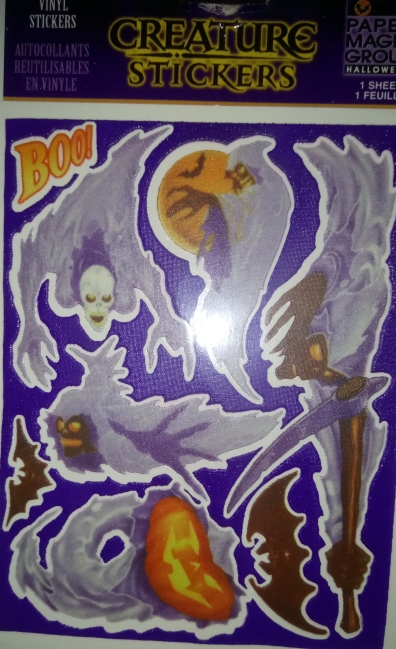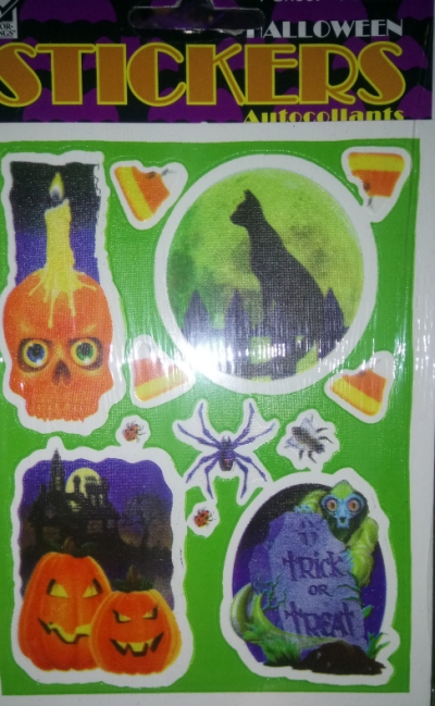 Speaking of stickers again, I ran into these ancient sticker sheets at a local party supply store and had to have them. They're made by Paper Magic Group, which I think I may have discussed once before because it's actually the manufacturer of countless Halloween items I've reviewed over the years, especially any with bright, colorful, cartoonish character designs. These stickers offer an interesting variety of ghosts and ghouls, but my favorite is the thing with the cat skull for a head, and the fact that for some reason there are also ladybugs. I could definitely get behind re-contextualizing ladybugs as one of the "creepy" insects. Then maybe one of the less respected arthropods can take their place as a "cute" one in our culture. I nominate pseudoscorpions.