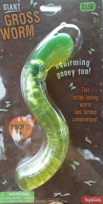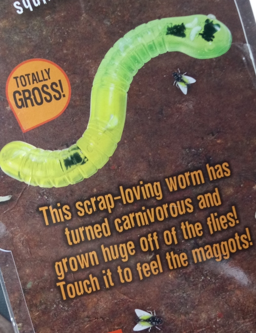 A cool friend actually sent me a whole box of insect toys and other stuff, but the single most Halloweenly item was one being sold at Five Below at the time, a store we don't have out here in Oregon. Look at this thing! It's a gigantic, rubber earthworm filled with slime, flies and maggots, and the packaging even felt the need to justify this with a whole store about a normal worm mutating in a garbage dump to become carnivorous...eating up all the poor maggots!! This is one of the most "me" things quite possibly ever mass manufactured. I don't dare ever remove it from the package; that stretchy, squishy rubber could too easily sustain damage or accrue contaminants over time, and I wouldn't get to display it with all those lovely accompanying graphics anymore either!