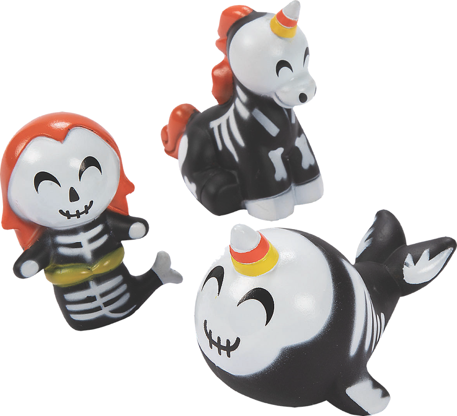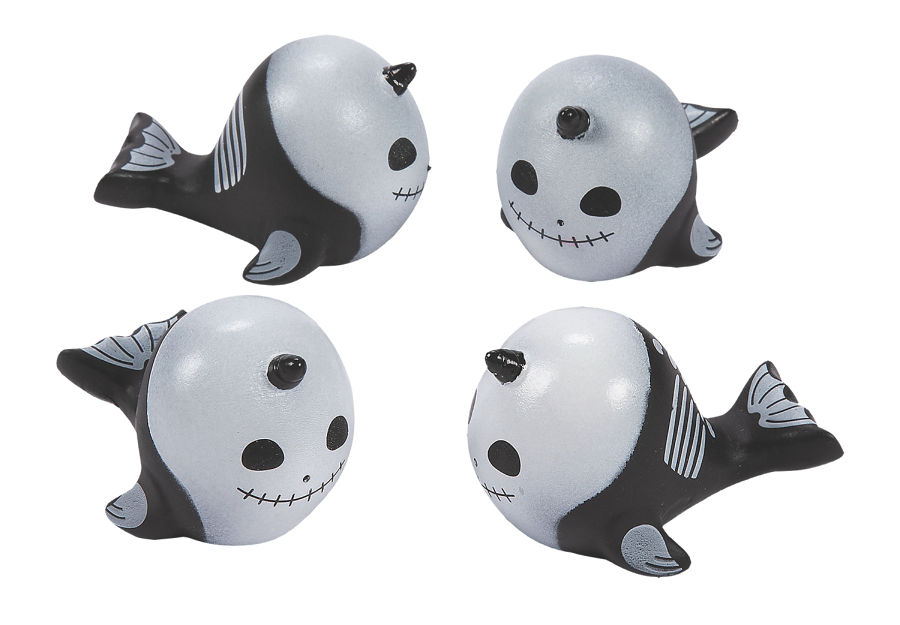 So how wonderful is it that the same company sells two different kinds of undead skeletal narwhal and they're ALMOST the same design but still subtly different in detail and sculpt? These have a much spookier, more gothic feel than the one with the candy corn horn, and I think I prefer it, since they kind of look like Jack Skellington Narwhals. They're also squirt toys!