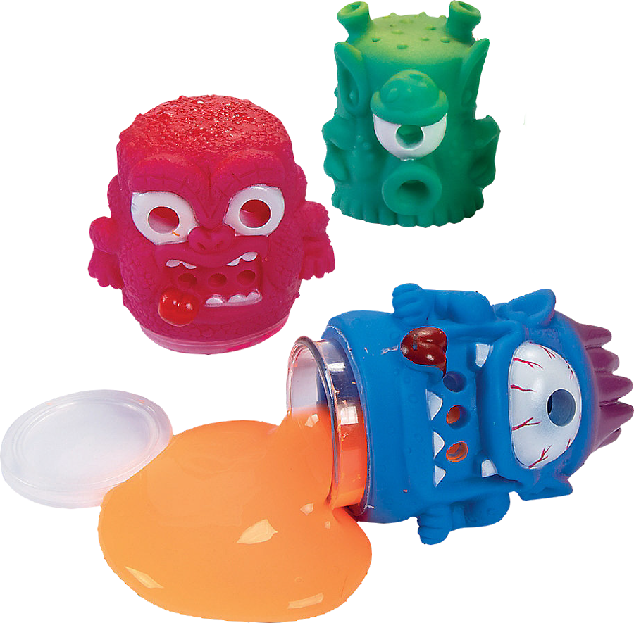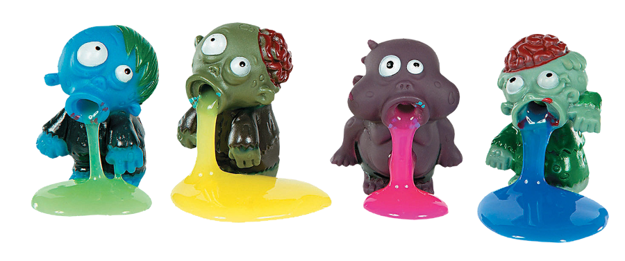 Are you ever NOT in for a good time when you hear those words together? These definitely do have the necessary orifices to exude slime, and I love every design they come in but I especially love the fat one with the purple slime, because its darkened skin is not that of natural dark flesh tone, but how a body looks when it's been rotting long enough to bloat and old blood has pooled under its skin. Lovely! The flaring funnel mouths are just there so the toy can function correctly at "sucking up" the slime, but I like to think this particular zombie virus just mutates their mouths into horrible, toothless goo cannons, presumably to feed more like a fly and digest their meals externally.