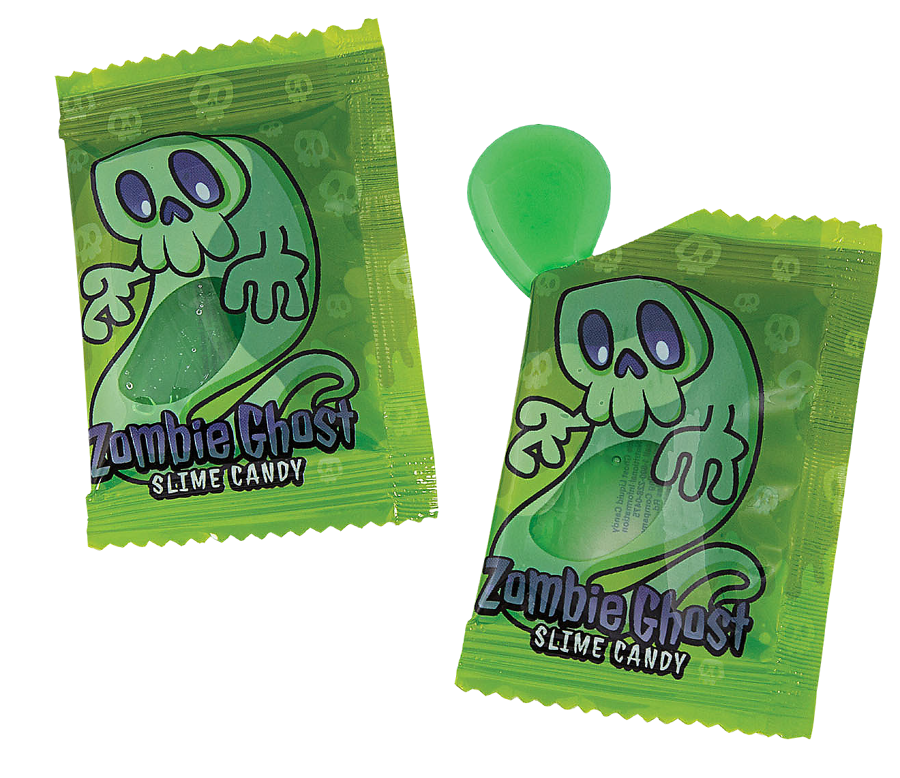 Our first and only candy example, I love that these are just little bags of edible slime and they still decided that constituted a "zombie ghost," which the official description says they have "captured" for us. The actual design of the zombie ghost on the bag is really cool, too, with its simple Duskull-esque cranium on a green, transparent ghost body. I'd like to think this is what you actually get when you "kill the brain" of a zombie, and then you're just more screwed.