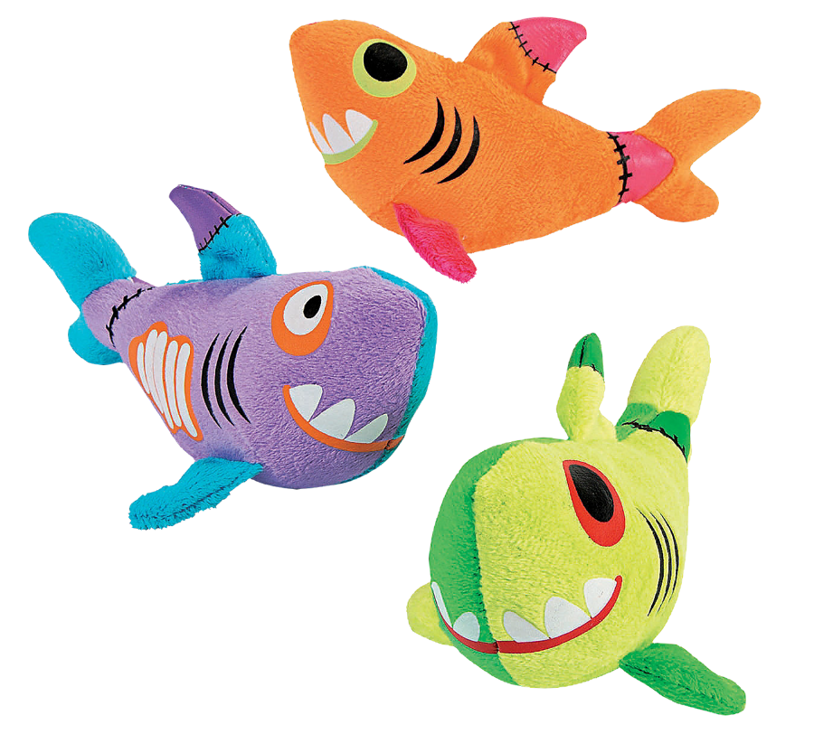 Arch nemeses or best friends to skeleton narwhals? I'm going to say best friends, because there's nothing on a skeleton narwhal that a zombie shark wants to eat anyway. How lovable are these, though? I can't even pick a favorite of their color schemes, and I'm glad they've got an exposed rib detail on one side, as well as presumably mis-matched eyeballs. The fact that they're stitched together also implies that they are artificial creations of some mad laboratory or evil government project, rather than just wild sharks tainted by a zombie virus. An Umbrella Corp experiment has never been so cuddly.