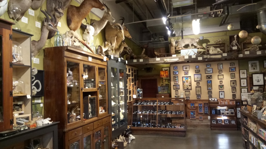 Paxton Gate has almost an entire wall and countertop devoted to insects, arachnids and crustaceans preserved the simple old fashioned way, like this gorgeous "peanut bug" or "crocodile lantern fly," but that's not all - they also host regular insect-mounting workshops! There's an entry free that can be up to sixty bucks a person, but that pays for the educational experience and for the specimen you get to take home yourself.