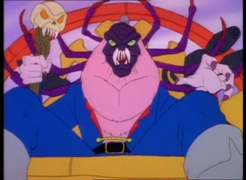 Those of you already familiar with Swamp Thing know that this is his arch nemesis from the comics and live-action materials, and a complex character with a rich fictional history we won't get into here, because I didn't know any of that as a kid and didn't care. I knew him only as the cackling jerk of a Saturday Morning toy commercial, who in this continuity acquires wrinkly, purple Nosferatu flesh when he gets splashed with his own experimental chemicals, so I guess that's what's wrong with Skinman and Deemo. His action figure gave him an equally vampiric-looking purple spider Biomask, but my VHS tape only had the first episode or so, and he never takes his spider form before the final credits roll. Having never caught the series on television, I'd never find out what his spider body looked like in the series until...actually, just now.