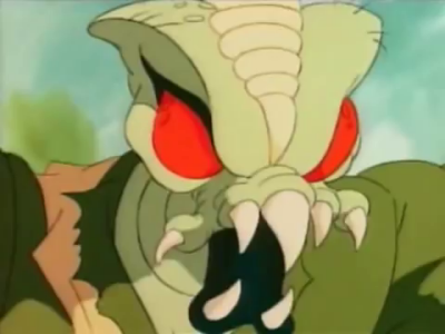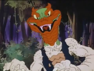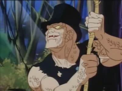 So this character, by modern standards, is kind of a little insensitive. "Voodoo" is a highly distorted and highly misunderstood concept, as is the idea of a "witch doctor," but that's what this guy is supposed to be; a "witch doctor" who'se got snakke scales, venomous fangs and a voodoo doll he carries around of Swamp Thing. I'm not sure he ever does any sympathetic magic with it or not; if so, I never saw the episode. All I do remember is him complaining about Swamp Thing's various superpowers while using the doll to demonstrate them - each only $6.99 at Toys R' Us, kids!. Man, Deemo, way to be a corporate shill!