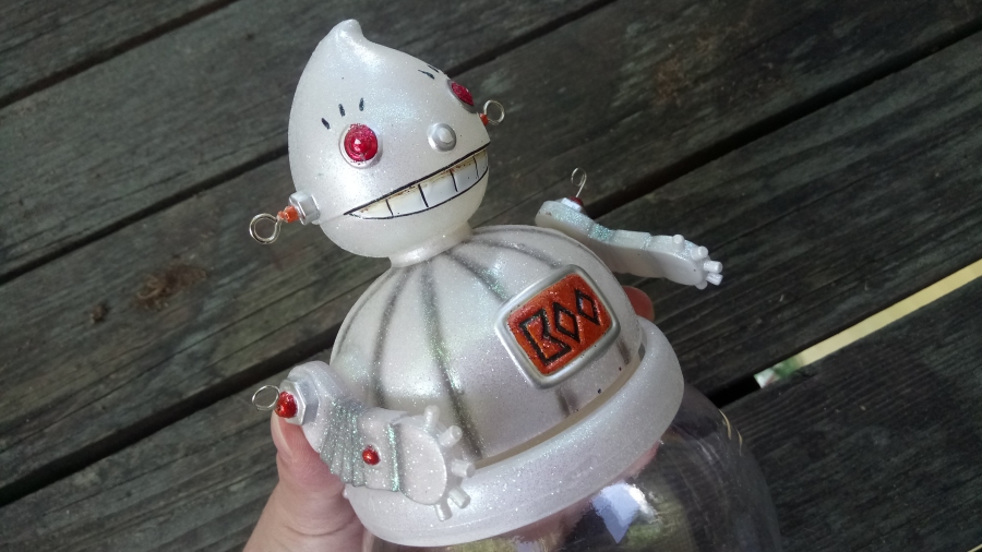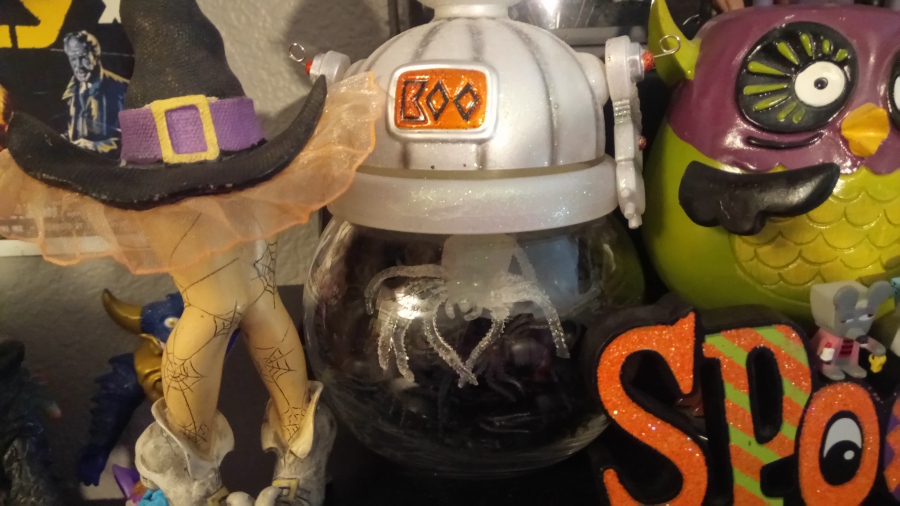 Sorry if my video don't work in your browser! This is a little, broken coffin with a skull and a single bony hand inside, and when activated, he lights up a wonderful pale green with red eyes, waving back and forth as he speaks in the persona of a lonely old man. Everything about that is adorable, though I hate to admit I wish items like this came with a mute function. No, I'm not against his dialog, but how rad would this just be as an all-night light source??? I could sleep so peacefully with a green skull slowly watching and waving for eight hours straight. He can regale us with his opinions on real estate in the morning!