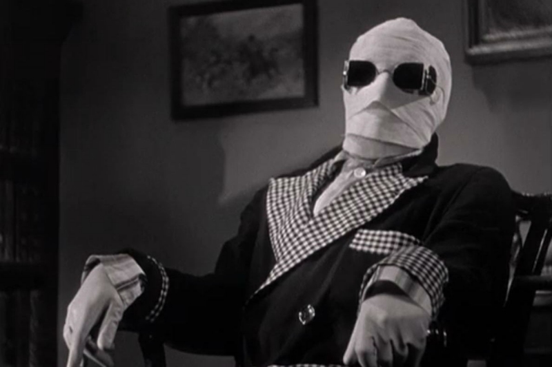 You know, I'm pretty sure the image of a mummy having nothing under its bandages really just comes from this other Universal monster, actually the chemist Doctor Jack Griffin who discovers, somehow, that a "bleaching" drug called monocane can make your entire body impossible to see. Bones, fluids, stomach contents, everything. It doesn't make the least bit of sense, but it's certainly a fun concept, ubt unfortunately the drug also messes with the brain and causes an unspecified "madness."